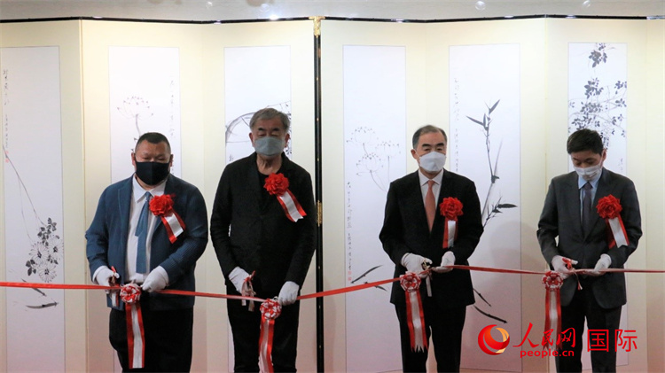 圖為中國駐日本大使孔鉉佑(右二)、日本著名建筑設計師隈研吾(左二)、旅日知名畫家王傳峰(左一)等為開幕式剪彩。人民網 吳穎攝