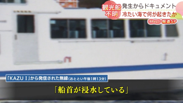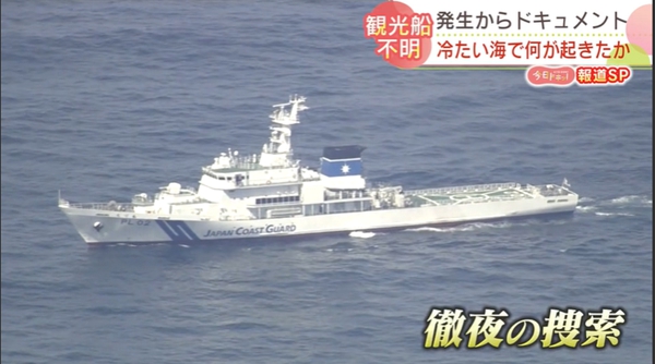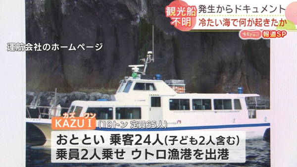 載有26人的日本觀光船23日在北海道東北部知床半島附近進水下沉(北海道新聞HBC報道截圖)