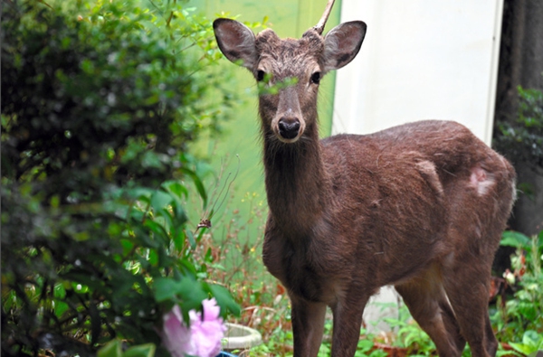 埼玉縣深谷市區出現野生鹿,在民居外面尋找食物。(圖片來源:《朝日新聞》)