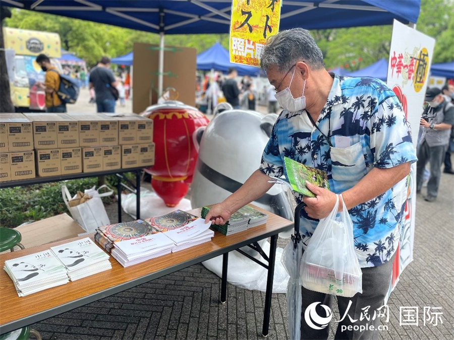 5月14日,中國駐東京旅游辦事處在“四川美食節”上設置展臺,一位日本游客駐足觀看。人民網 吳穎攝