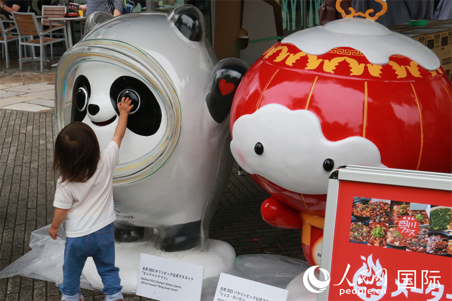 5月14日,“四川美食節”活動現場擺放的冬奧吉祥物“冰墩墩”深受日本小朋友喜愛。人民網 吳穎攝