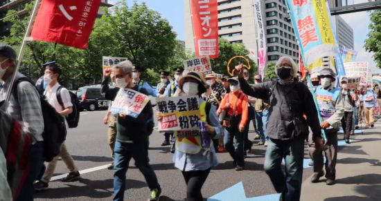 5月23日,民眾在日本東京街頭舉行抗議集會。(視頻截圖)