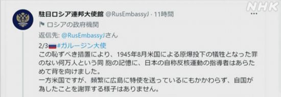 海外網5月26日電 據日本NHK電視臺26日消息,日本廣島市民活動推進課日前稱,鑒于俄烏局勢,今年的“悼念原子彈爆炸死難者暨祈禱和平儀式”將不邀請俄方出席。對此,俄羅斯駐日本大使加盧津在社交媒體用日語表示,“這是一個應該引以為恥的決定”。
