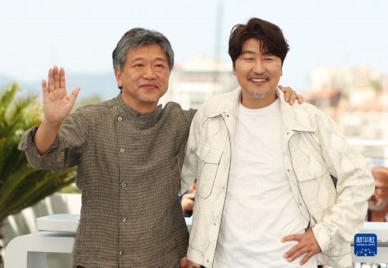 5月27日,在法國戛納舉行的第75屆戛納國際電影節上,日本導演是枝裕和(左)和韓國演員宋康昊出席影片《掮客》的拍照式。(新華社記者 高靜 攝)