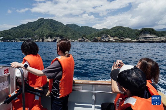 6月12日,游客乘船游覽日本靜岡縣賀茂郡西伊豆町堂之島公園。伊豆八景之一的堂之島位于伊豆半島西海岸的海灣內,有許多小島星羅棋布地散落其間。新華社記者 張笑宇 攝