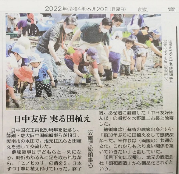 人民網訊 據中國駐大阪總領事館消息,6月19日,被網友們親切稱為“薛叔”的中國駐大阪總領事薛劍應邀到阪南市開展插秧交流活動,在雙方商定的“中日友好示范田”共同種下紀念中日邦交正;50周年的青蔥稻苗,并相約秋季共享收獲喜悅;顒雍,“薛叔”攜阪南市市長水野謙二與蘇州市吳中區舉辦視頻交流會,就吳中區與阪南市友好交流的歷史與未來進行了深入交流。