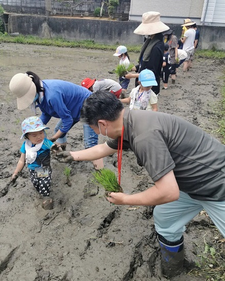 (“薛叔”手把手指導年紀最小的日本幼童插秧)