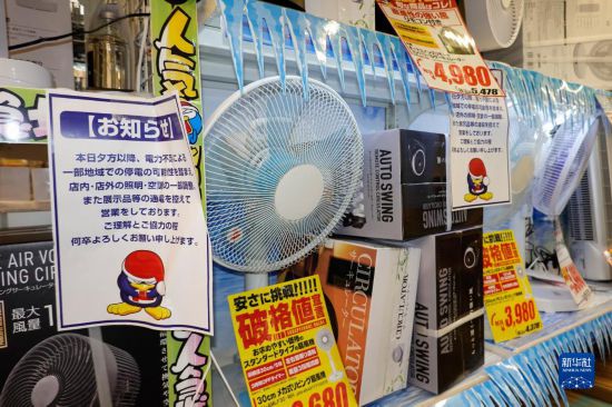 這是7月2日在日本東京目黑區一家超市拍攝的節電通知和風扇樣品。新華社記者 張笑宇 攝