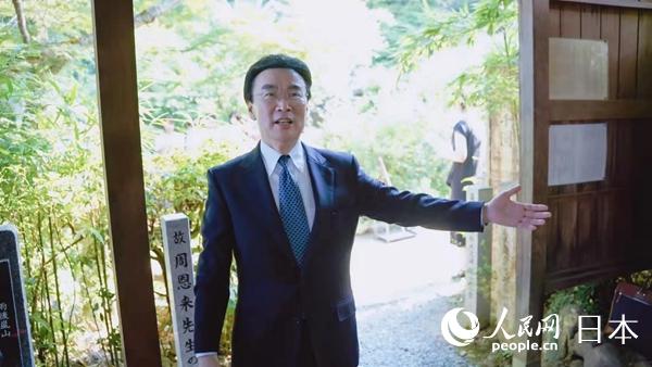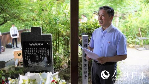 6月30日,在日中國企業協會會長王家馴在瞻仰周總理《雨后嵐山》詩碑紀念活動上致辭。(圖片提供:青城)