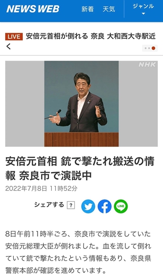 【日本前首相安倍晉三在奈良遭槍擊受傷倒地】
