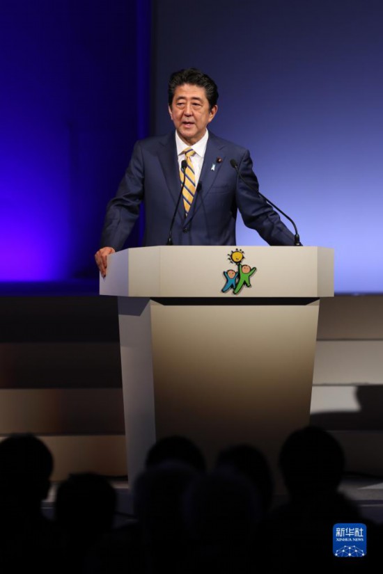 這是2019年2月10日,時任日本首相、自民黨總裁安倍晉三在東京參加自民黨大會的資料照片。新華社記者 杜瀟逸 攝