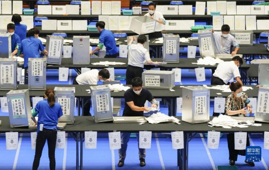 7月10日,工作人員在日本東京港區體育中心進行參議院選舉投票開票作業。新華社/共同社