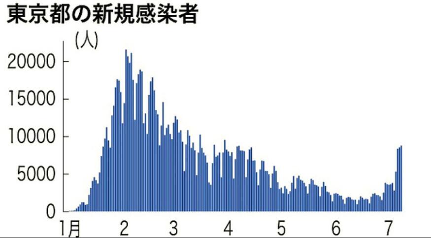 7月10日,東京都新增確診病例9482例,單日新增與前一個周日相比增加5694例,增長了約1.5倍,已連續23天超過前一周同期,并連續2天超過9000例。截至7月10日,東京都最近一周的日均新增確診病例數為7559.9例,是前一周的236.2%。
