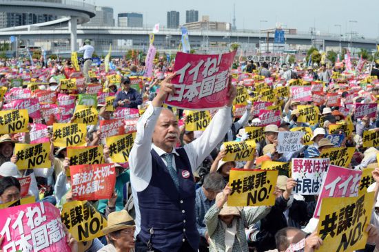 2017年5月3日,日本民眾在東京參加集會,紀念“和平憲法”頒布70周年,抗議日本政府的修憲企圖。(新華社記者馬平攝)