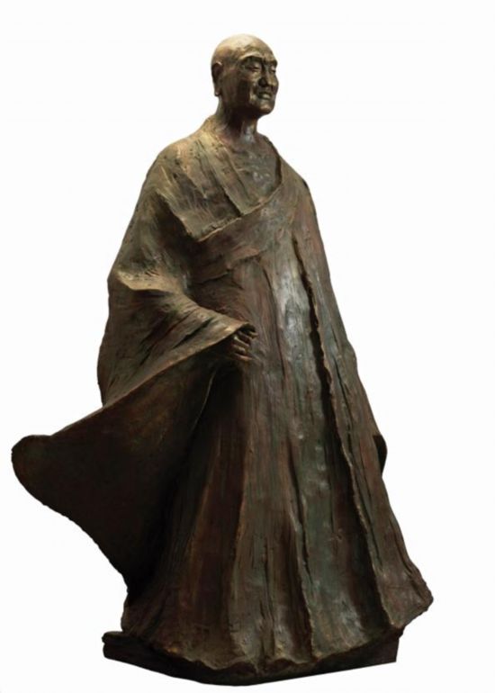 《鑒真像》服飾簡潔質樸,莊重厚實的形體傳達出內心的仁厚與善良。吳為山說:“我想象鑒真站在風浪聚起的船頭,雖雙目失明,但表情從容,堅定的信念支撐著他克服一切艱難險阻東渡日本!