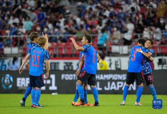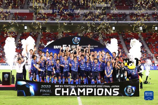 7月27日,日本隊在頒獎儀式上慶祝奪冠。新華社發(日本足球協會供圖)