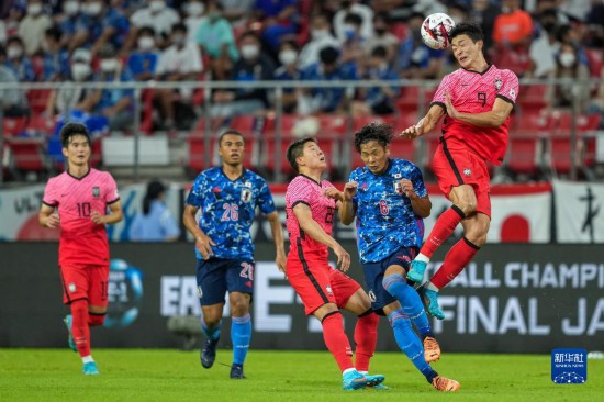 7月27日,韓國隊球員曹圭成(右上)在比賽中爭頂。新華社記者 張笑宇 攝