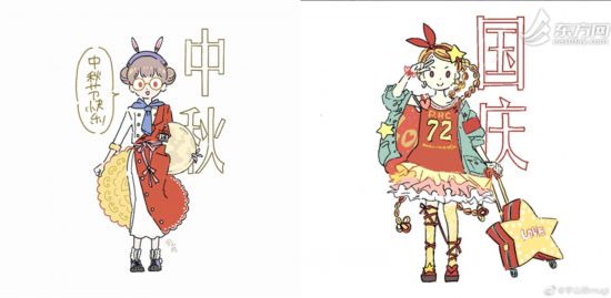對中國文化的喜愛,她以她的畫作來體現。在她的微博上,記者發現了她把中國節日擬人化的畫作。對此,她表示,其初衷是想把這些節日以接地氣的表達方式傳遞給日本人,所以覺得人物會比較可親可敬。在中秋節的時候,她將月餅、兔子、甜點師共同結合在了一個姑娘身上,意寓團圓。而國慶節,在她筆下是一個拖著行李去旅行的姑娘,代表著現在國慶小長假,很多中國人的生活方式是旅行。除擬人化的中國節日作品外,宇山紡還畫了《上海繪日記》、《日本人住在老房子》、《封控下的日本人》、《南京繪日記》等系列作品,將自己生活中的細枝末節記錄下來。