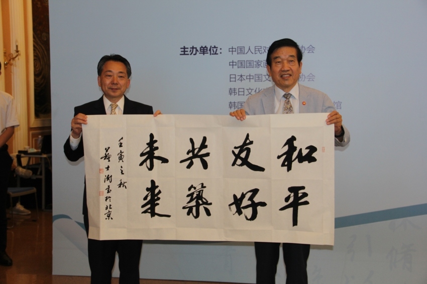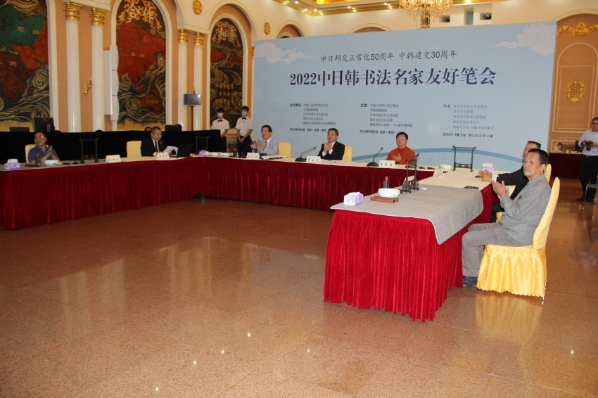 中國人民對外友好協會副會長袁敏道,中國書法家協會名譽主席蘇士澍,中國國家畫院原副院長、中國文化藝術發展促進會副主席曾來德,著名書法家朱培爾、魏杰;日中文化交流協會常任委員、日本書道院會長中村云龍,日中文化交流協會專務理事中野曉,日本著名書法家稻葉如龍、平山美影;韓日文化交流會議委員長鄭求宗,韓國藝術殿堂首爾書藝博物館館長李東拲,韓國書道協會會長金榮基,以及三國的青年代表出席了當天活動;顒又,書法名家們視頻連線交流溝通,潑墨揮毫現場創作,以筆會友、以文傳情,共同表達對中日韓三國美好未來的殷切期待。