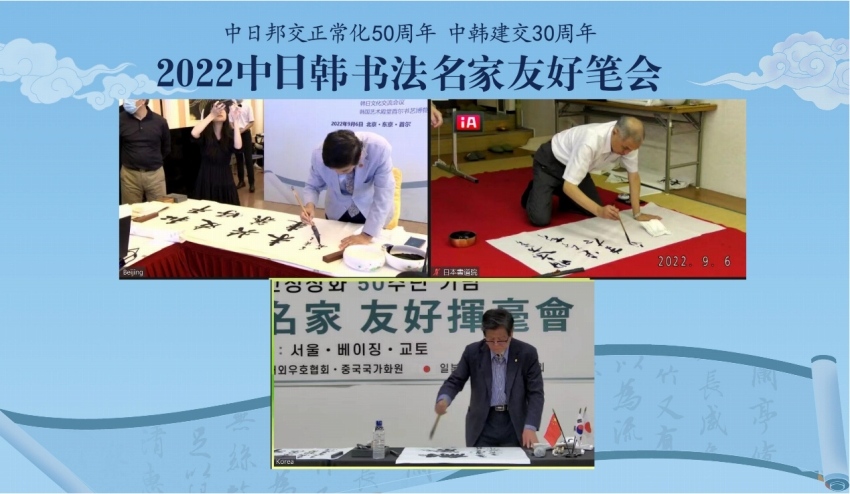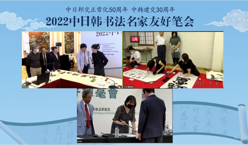 中日韓三國書法家通過視頻連線展示現場書法創作。中國人民對外友好協會供圖