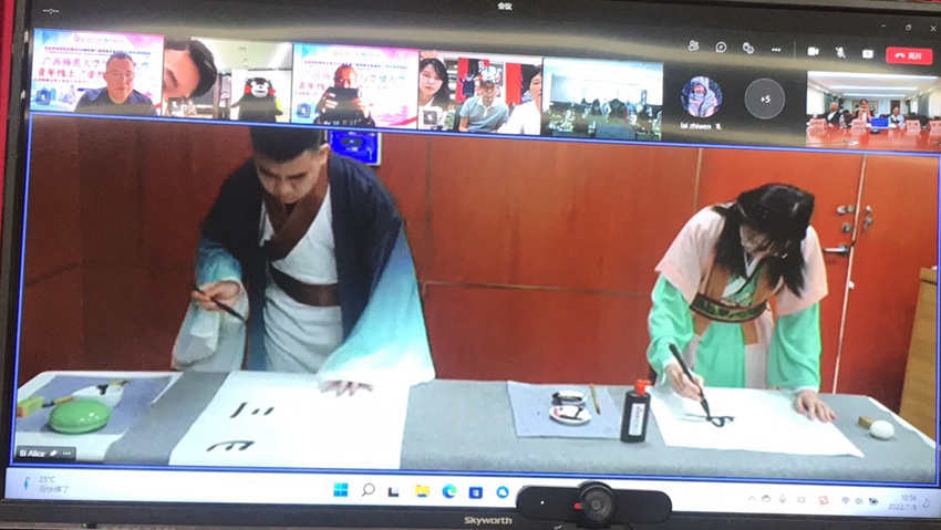 廣西壯族自治區人民對外友好協會辦公室負責人與熊本縣上海事務所所長藤本修宏先后為中日青年學生介紹了廣西與熊本過去40年的交流合作情況,加深了青年學生對兩區縣友好關系的了解。雙方青年通過視頻了解了對方的歷史、文化、藝術、旅游資源和特色美食等,對彼此文化產生了濃厚的興趣。在藝術作品展演環節,廣西師范大學的同學們現場創作了書法作品、介紹了扎染的制作過程,崇城大學的同學們展示了動漫、美術等藝術作品,讓大家體會到了中日藝術各自的獨特魅力。雙方還一起觀看了“廣西師范大學與崇城大學合作交流18周年回顧視頻”,重溫了兩校豐富多彩的交流活動。在交流互動環節,青年學生代表分享了對彼此城市的印象,表達了對疫情過后開展線下交流的期待。熊本縣還專門安排熊本的吉祥物—“熊本熊”到崇城大學與廣西師范大學的學生進行線上交流互動,將活動氣氛推向了高潮。最后,學生們用中文和日文合唱《友誼地久天長》,活動圓滿落下帷幕。