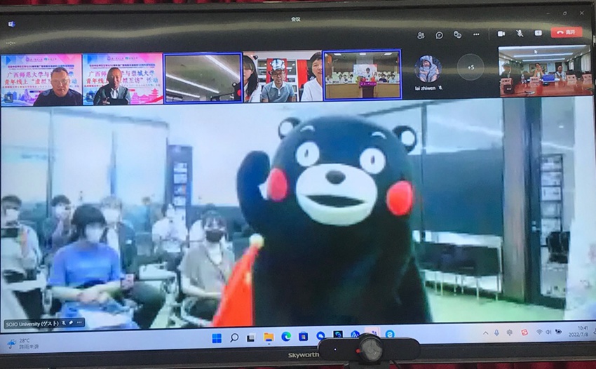 在廣西壯族自治區人民對外友好協會、熊本縣上海事務所的共同發起和支持下,2022年7月8日上午,紀念中日邦交正;50周年暨廣西壯族自治區與熊本縣結好40周年—廣西師范大學與崇城大學青年“虛擬互訪”活動在線上成功舉辦。廣西壯族自治區人民對外友好協會辦公室負責人和熊本縣上海事務所、熊本縣觀光交流政策課、八代市國際課代表通過視頻方式出席活動,廣西師范大學和崇城大學共17名老師、24名學生參加了活動;顒觾热莅ü矓V西與熊本友誼,“云游”桂林、“云游”熊本、藝術作品展演、廣西師范大學與崇城大學合作交流回顧、互動交流等。