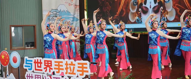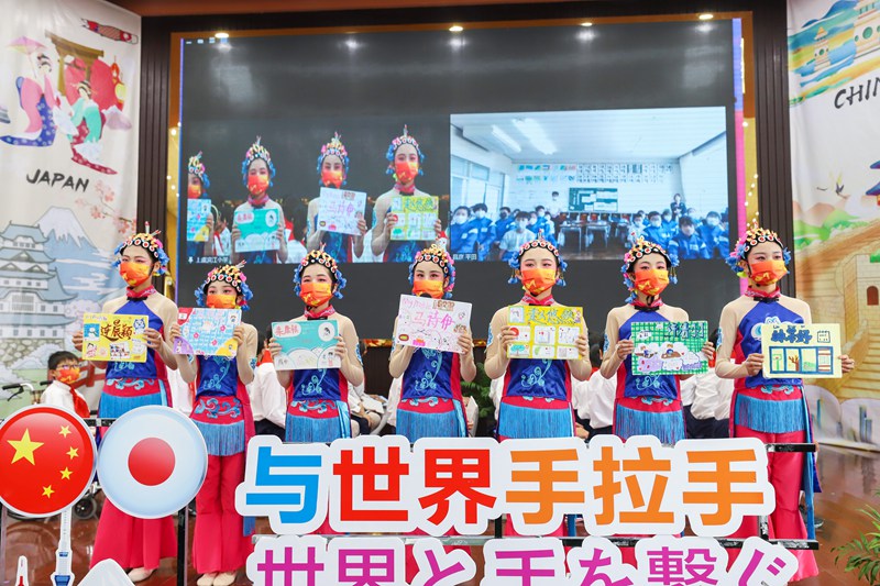 在表演環節,上虞區濱江小學帶來了舞蹈《京韻》,展示了中國的國粹經典,讓日本小伙伴贊嘆不已。隨后,中日兩地學生在教師的帶領下,互相學習了一句中文和日語。透過語言,雙方雖然遠隔千里,但是心意相通、彼此熟悉;顒咏Y尾,兩校六年級學生隔著屏幕共同唱響亞運會主題曲《心心相融》,表達了中日童心童盟,愛達未來!