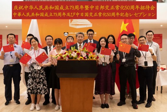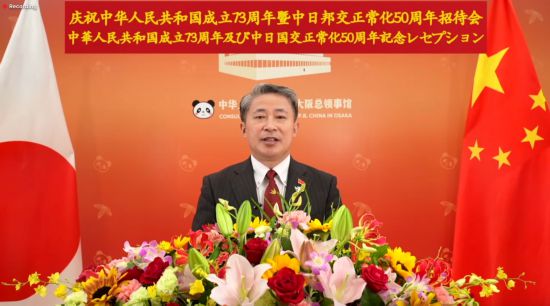 9月28日,中國駐大阪總領館舉辦慶祝中華人民共和國成立73周年暨中日邦交正;50周年線上招待會,日本政府代表、關西擔當特命全權大使姫野勉以及大阪府議會日中友好親善議員聯盟會長三田勝久、大阪府日中友好協會會長梶本德彥在線致辭,大阪府知事吉村洋文、大阪市長松井一郎委托專人參會代讀賀辭,領區地方政府、經濟界、文化界、友好團體、教育機構、主流媒體、在日中資機構、華僑華人、留學生及各國駐阪領事機構等200余人在線出席。