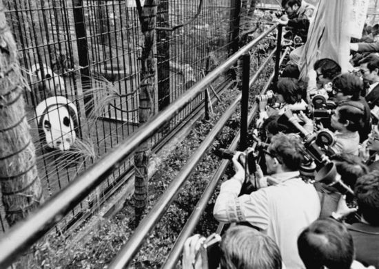 1972年11月,中國大熊貓“康康”和“蘭蘭”在日本東京上野動物園第一次和觀眾見面時,成為日本新聞界的采訪中心。新華社發