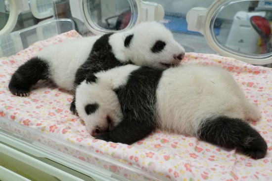 這是2021年8月5日拍攝的大熊貓幼崽“蕾蕾”(左)和“曉曉”(右)。新華社發(東京動物園協會供圖)