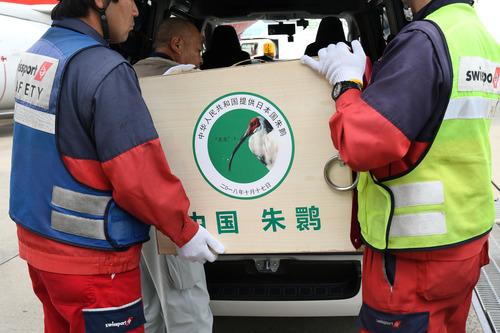 2018年10月17日,中國向日本提供的朱鹮抵達日本千葉縣成田機場。 新華社記者華義攝