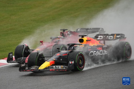 10月9日,紅牛車隊荷蘭車手維斯塔潘(前)與法拉利車隊摩納哥車手勒克萊爾在比賽中。新華社記者 張笑宇 攝