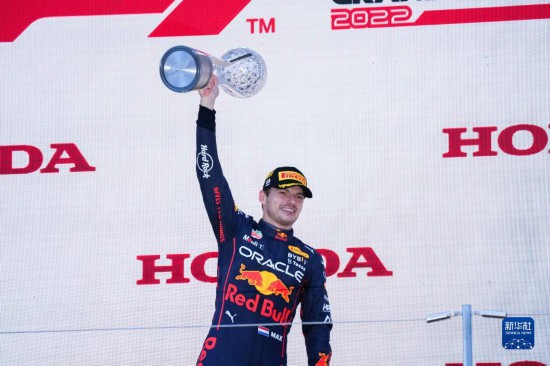 10月9日,紅牛車隊荷蘭車手維斯塔潘在頒獎儀式上捧杯慶祝。新華社記者 張笑宇 攝