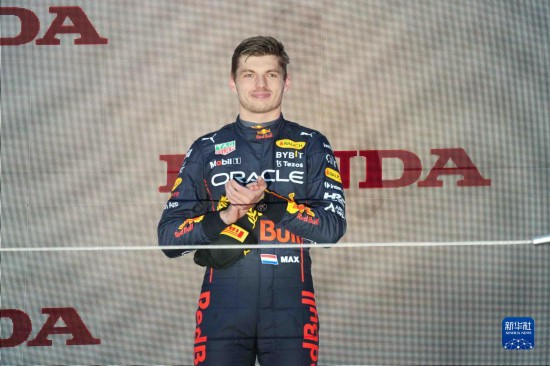 10月9日,紅牛車隊荷蘭車手維斯塔潘在頒獎儀式上。新華社記者 張笑宇 攝
