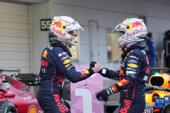10月9日,紅牛車隊荷蘭車手維斯塔潘(左)與隊友墨西哥車手佩雷茲相互慶祝分別獲得本站比賽冠、亞軍。新華社記者 張笑宇 攝