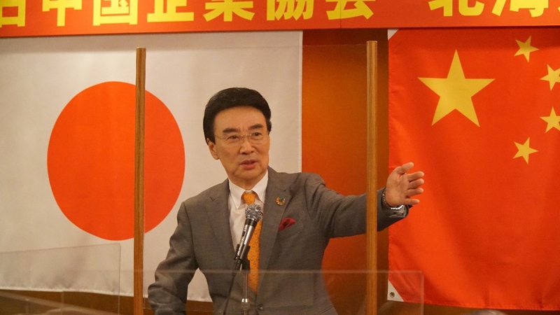10月7日,在日中國企業協會會長王家馴在和北海道方面進行的交流會上致辭。(吳穎 攝)