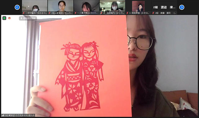 活動中,兩省縣的學生代表分別介紹了各自的城市。從吉林的凈月潭漫步到鳥取的沙丘,從吉林的六鼎山到鳥取的大山遨游,“云”覽旖旎風光;從吉林特色辣白菜、冷面到鳥取的螃蟹、二十世紀梨,“云”享特色美食......此外,吉林外國語大學的學生現場教學,帶大家領略中國剪紙藝術魅力。黃奕涵同學展示自己為本次交流活動精心準備的剪紙作品,穿旗袍的中國小朋友和穿和服的日本小朋友挽手相依,表達了她對中日兩國友誼長存的美好祝愿。