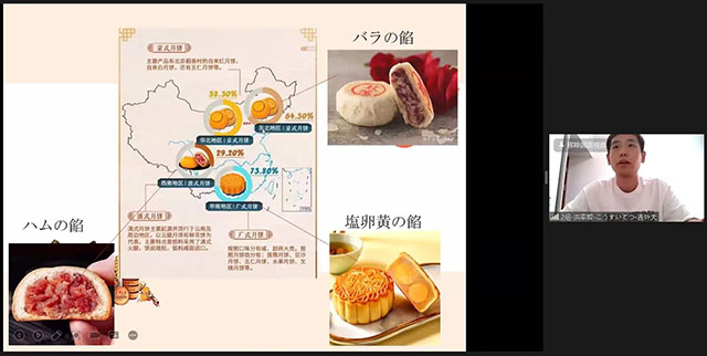 洪率哲同學介紹了中秋節的傳統,播放了自己制作月餅的視頻,講解了“但愿人長久,千里共嬋娟”的中國文化內涵。鳥取大學的學生與大家一起折紙互動,鳥取環境大學的學生介紹了日本劍玉游戲(けん玉遊び),邀請大家觀看了“鳥取傘舞”。學生們通過這種豐富多樣的交流互動,加深了彼此了解。