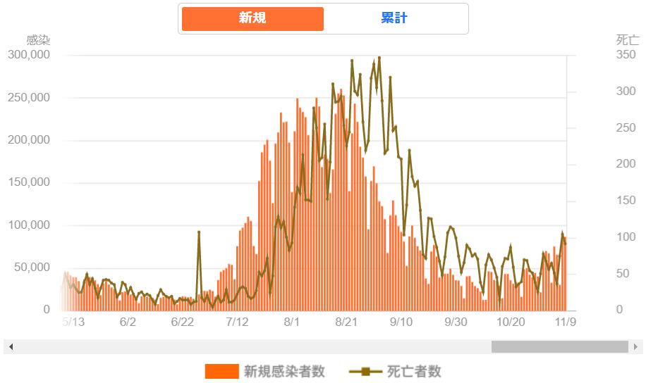 日本在今年7月中旬至9月下旬期間,曾連續10周的新增確診病例數高居世界首位。