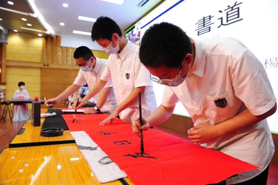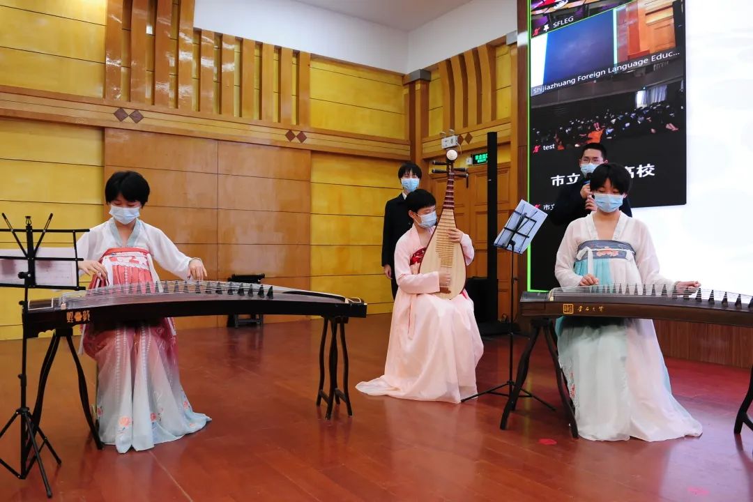 八年級日語生用傳統樂器進行了演奏,現場揮毫展示書法作品。在古箏、琵琶悠揚的樂曲聲中,書法組的三位男同學潑墨抒情,分別用隸書、楷書、行書書寫出“中日友好,源遠流長,松柏長青,共筑未來”,并用日語向日本學生介紹了書法內容,表達了對中日友好的祝福之情。此外,同學們用日語向長野市的同學們介紹了傳統樂器的歷史以及書法字體的由來和特點,進一步展現了中華文化的獨特魅力。