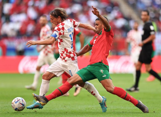 11月23日,克羅地亞隊球員莫德里奇(左)與摩洛哥隊球員阿格德拼搶。 新華社記者丁旭攝