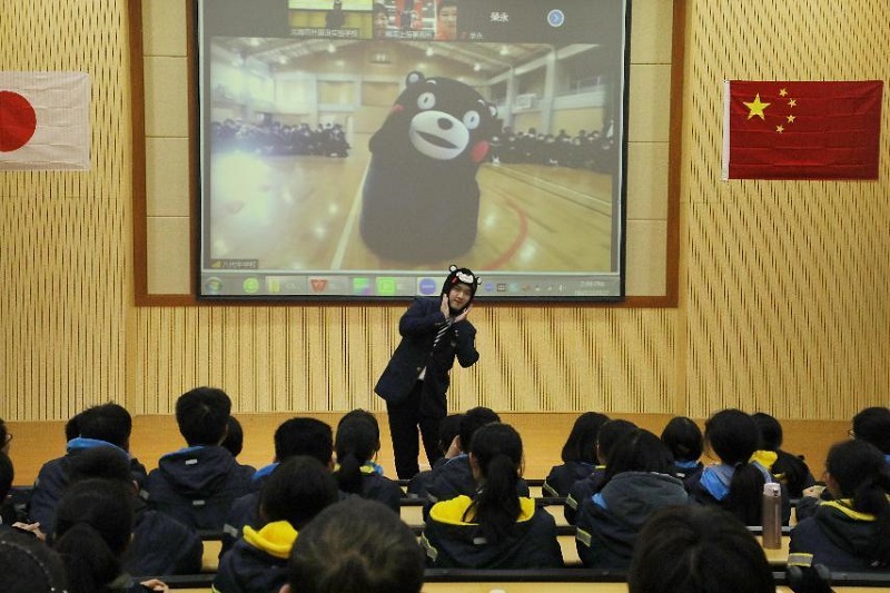 另外,中方學生還準備了《五十音圖歌&拍手歌》和《過年好》節目,自信且流暢的歌聲唱出了青少年的青春活力,年味十足的繪本劇舞蹈則生動活潑地展示了中國過年習俗及傳統文化。同時,八代中學邀請了“熊本熊”團隊到達現場進行互動交流,活潑可愛的“熊本熊”贏得了陣陣掌聲。
