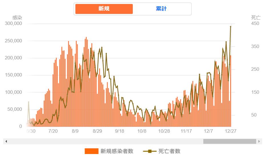 人民網東京12月28日電 據《朝日新聞》報道,12月27日,日本全國新增新冠肺炎確診病例20萬8235例,單日新增與上周二相比增加了1萬8249例,山口、愛媛、島根、岐阜四縣再次刷新最高紀錄。當天新增死亡病例438例,單日新增首次超過400例,F有重癥病例582例。