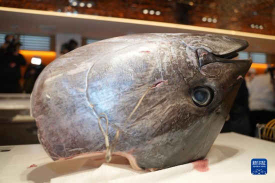這是1月5日在日本東京表參道一家餐館拍攝的最高價金槍魚的魚頭。新華社記者 張笑宇 攝