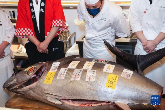 日本東京豐洲市場5日迎來今年首場金槍魚競拍交易,一尾來自青森縣大間港的藍鰭金槍魚以3604萬日元(1美元約合132日元)價格成交,創下當天最高競拍價。這也是“大間金槍魚”連續11年贏得新年首拍最高價。