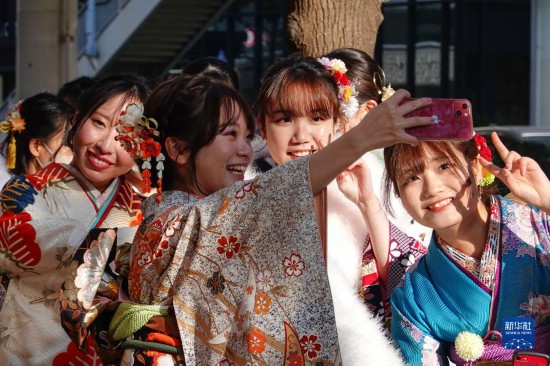 當日,青年男女在日本橫濱參加成人禮,慶祝自己成年。根據日本自2022年4月1日開始施行的《民法》,成人年齡由原來的20歲下調至18歲。每年1月的第二個星期一,日本各地會為年輕人舉辦成人禮儀式和活動。新華社記者 張笑宇 攝