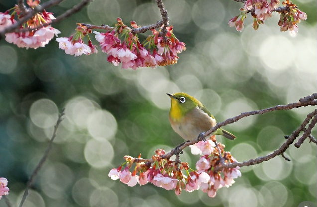 停在櫻花樹枝上的繡眼鳥。(圖片來源:《朝日新聞》)