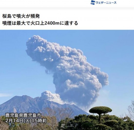 中新網2月14日電 據日媒報道,當地時間14日,位于日本鹿兒島縣櫻島的火山再次噴發,火山灰最高噴至距離火山口2400米的高度。