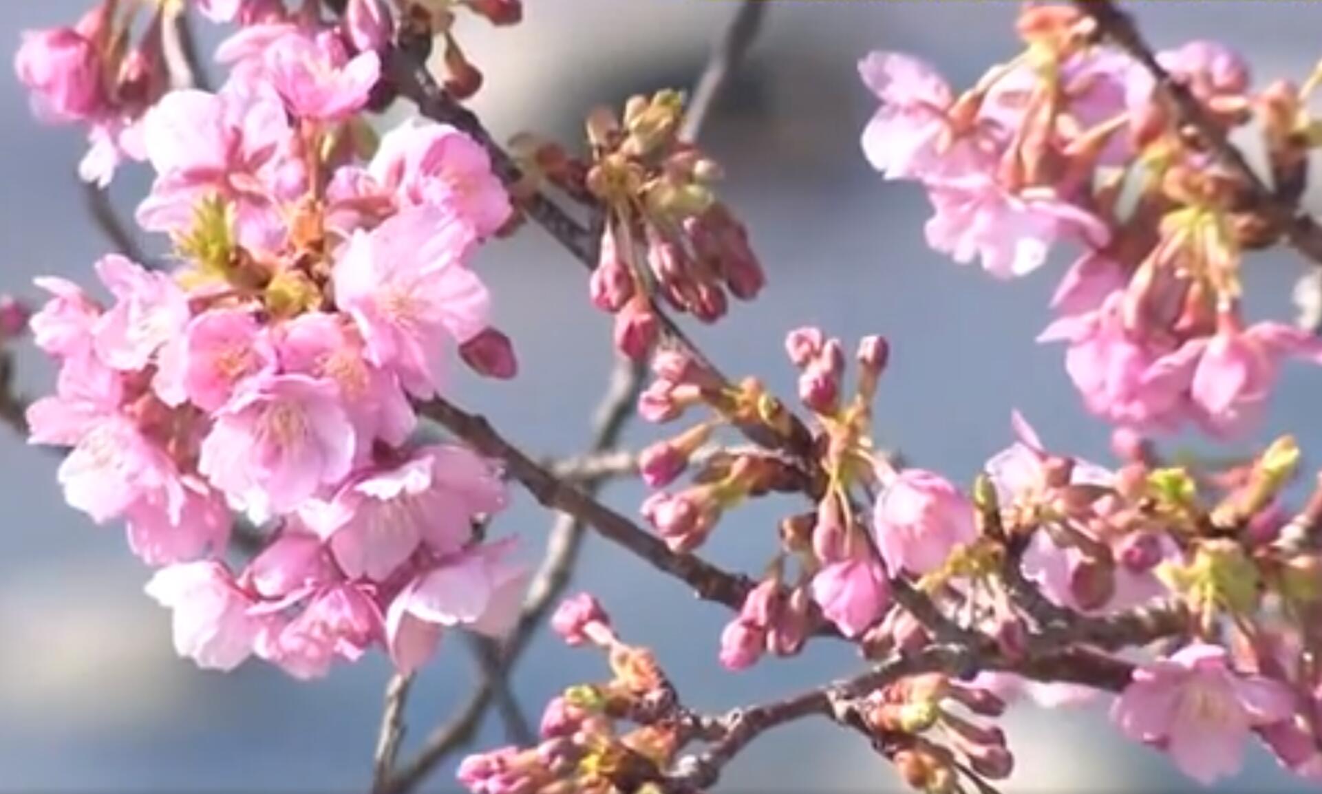 盛開的河津櫻。(視頻截圖)
