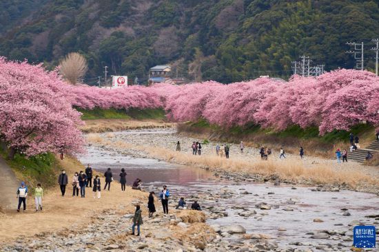 2月24日,游客們在日本靜岡縣河津町欣賞河津櫻。新華社記者 張笑宇 攝